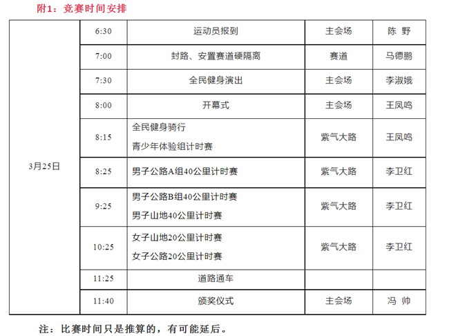 4、比赛的第一组是青少年组和大众骑行活动(不参加开幕式,提前到起点准备),请计时赛选手不要提前进入赛道,待青少年组和大众骑行活动结束后,再听从裁判员安排有序进入赛道;